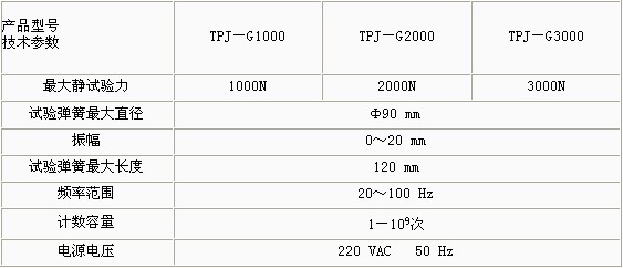 產(chǎn)品概述: TPJ-G系列彈簧高頻疲勞試驗(yàn)機(jī)采用電磁激勵(lì)、試件(彈簧)共振原理,系統(tǒng)自動(dòng)處于最佳諧振狀態(tài),重慶彈簧試驗(yàn)機(jī),勿需調(diào)整,起動(dòng)一觸即發(fā),自動(dòng)彈簧試驗(yàn)機(jī),性能穩(wěn)定可靠。操作簡(jiǎn)單,操作人員勿需培訓(xùn)。 功能特點(diǎn): 試驗(yàn)機(jī)設(shè)有振動(dòng)次數(shù)及頻率的數(shù)字顯示及次數(shù)預(yù)置、記憶等功能。該機(jī)既可以做單對(duì)彈簧的試驗(yàn),彈簧試驗(yàn)載荷,也可做多對(duì)彈簧的試驗(yàn)機(jī)。 技術(shù)參數(shù):