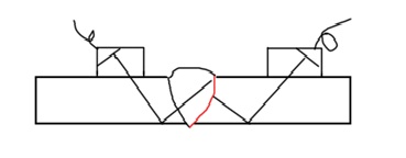 圖 1 對(duì)接焊焊縫余高未磨平、只能單面探測(cè)。可使用斜探頭、觀察一次或二次回波在焊縫兩側(cè)進(jìn)行掃查探傷。