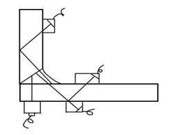 圖 2 角焊縫。綜合使用斜探頭、直探頭多面、多次探測(cè)。